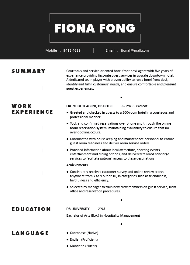 If you are looking for a position in hotel or hospitality, read and live by this sample resume and example sentences featuring some of the most basic elements that recruiters look for. Customise them accordingly to fit your specific needs and qualifications.