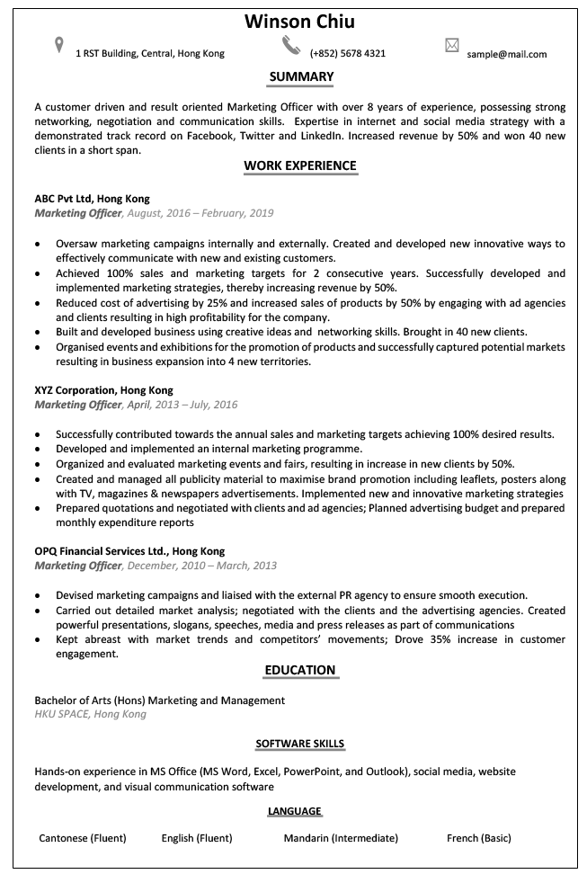 XYZ Corporation, Hong Kong Marketing Officer, April, 2013 – July, 2016 - Successfully contributed towards the annual sales and marketing targets achieving 100% desired results.