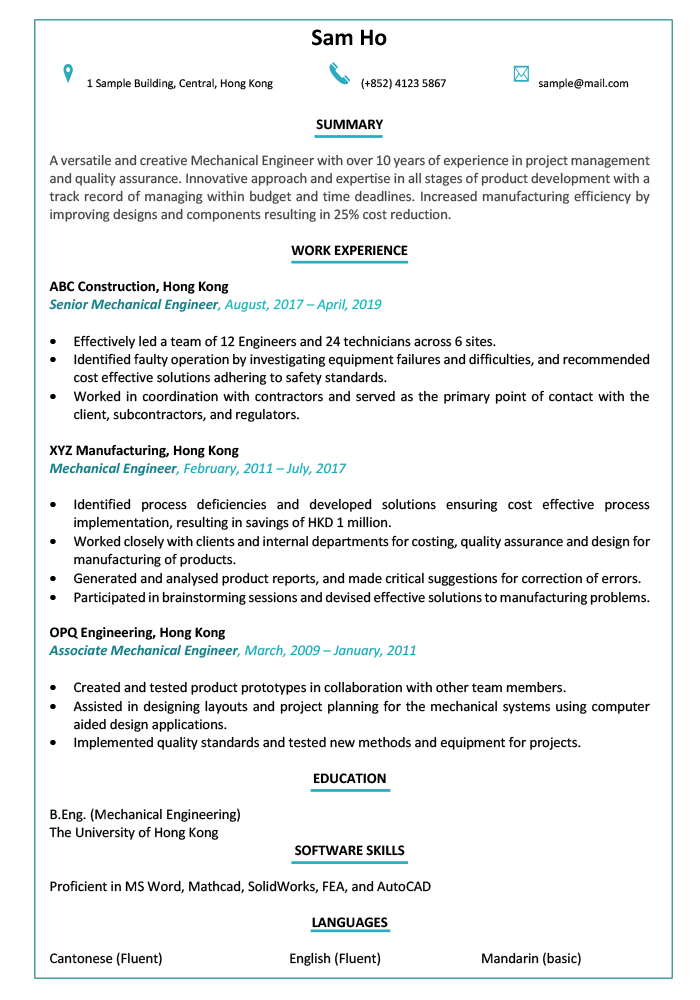XYZ Manufacturing, Hong Kong Mechanical Engineer, February, 2011 – July, 2017 - Identified process deficiencies and developed solutions ensuring cost effective process implementation, resulting in savings of HKD 1 million.