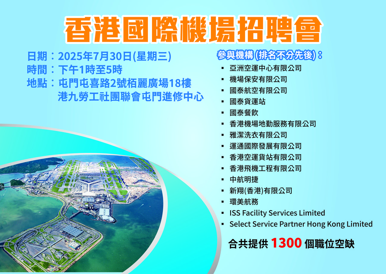 日期:7月30日 時間:下午1時至5時 地點:屯門屯喜路2號柏麗廣場18樓港九勞工社團聯會屯門進修中心 職位詳情