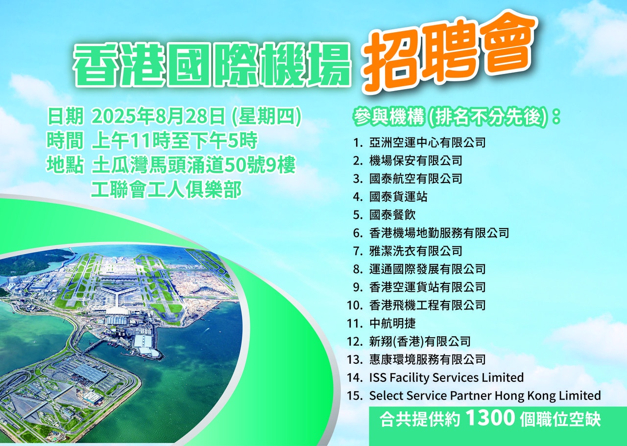 日期:8月28日 時間:上午11時至下午5時 地點:土瓜灣馬頭涌道50號9樓工聯會工人俱樂部 職位詳情
