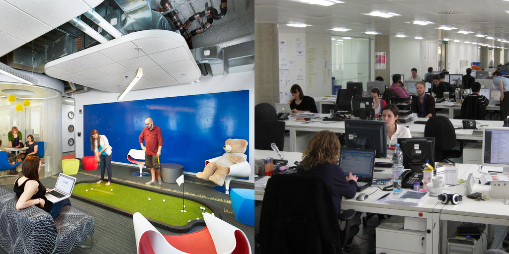 好到點?免費零食、無限手調咖啡、無限假期、office入面已經有無數娛樂。而且通常個office都會裝修到好colourful,去刺激員工創意。如果係美國等地,工作地點有室外地方的話,間公司亦會將呢啲室外空間佈置得好舒服,眼見之處全部都係草地,寬闊嘅行人路,仲有好多鮮豔嘅擺設。