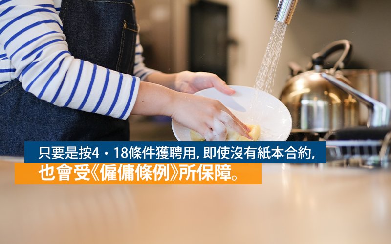 不要傻傻的以為「連續性合約」必須要有一份實體合約才算成立。按《僱傭條例》規定,無論僱傭合約以書面還是口頭方式訂立,僱員的權益均受到《僱傭條例》的保障。換句話說,只要你是按4‧18條件獲聘用,即使沒有紙本合約,你也是受「連續性合約」所聘用,可以享有休息日、疾病津貼等,而不用一紙合約來證明。