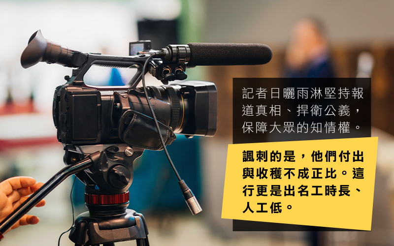 足不出戶能知天下事?全靠有一班默默付出的記者每天跑新聞、發掘不同的時事題材,我們才能看到最接近社會現實的一面。尤其是近來的香港新聞,深深感受到傳媒行業這個第四權的重要性。前線記者猶如在戰地報新聞,要捱催淚煙、受暴力攻擊或阻撓,然而他們仍然堅持報道真相、捍衛公義,保障大眾的知情權。諷刺的是,他們付出與收穫不成正比,這一行的待遇,出名人工少工時長,但為甚麼仍能吸引到這麼多人入行?
