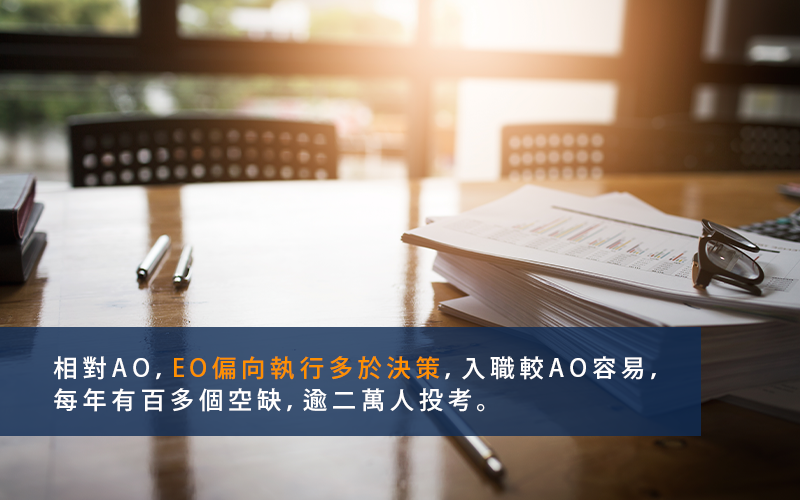 相對政務主任(AO),EO偏向執行多於決策,入職較AO容易,但也是極難成功。每年雖然有百多個空缺,不過競爭相當激烈,年年都有逾二萬人投考。要成功考獲EO,必須先通過考試,才進行面試。除了學業成績好,還要掌握時事,亦要對行政管理工作認識。有時政府會寧願空置職位,也不會聘請不達標的考生。
