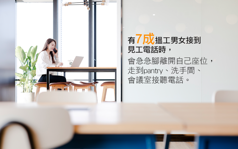 有調查指,正物色跳槽機會的搵工男女,如果在上班時間,於公司接到疑似面試電話時,有七成以上的人會急急腳離開自己座位,走到pantry、洗手間、會議室接聽電話,人力資源專家表示,這種以為可防止隔牆有耳的做法,反而更加突兀,因由你忽然拿起手機走位的大動作開始,已經引人注意,如再加上你刻意壓低聲線,以「嗯,嗯,嗯」作開場白,以便拖延多少少時間,好讓自己到達「安全位置」而後展開對話,其實,不單止已有人看在眼裡,這組開場白對於約你面試的HR來說,是一種不夠禮貌之表現,儘管致電者可能只是部門小薯一名,但很多時會由姐級哥級主管親自「落order」,所以,專家意見是: