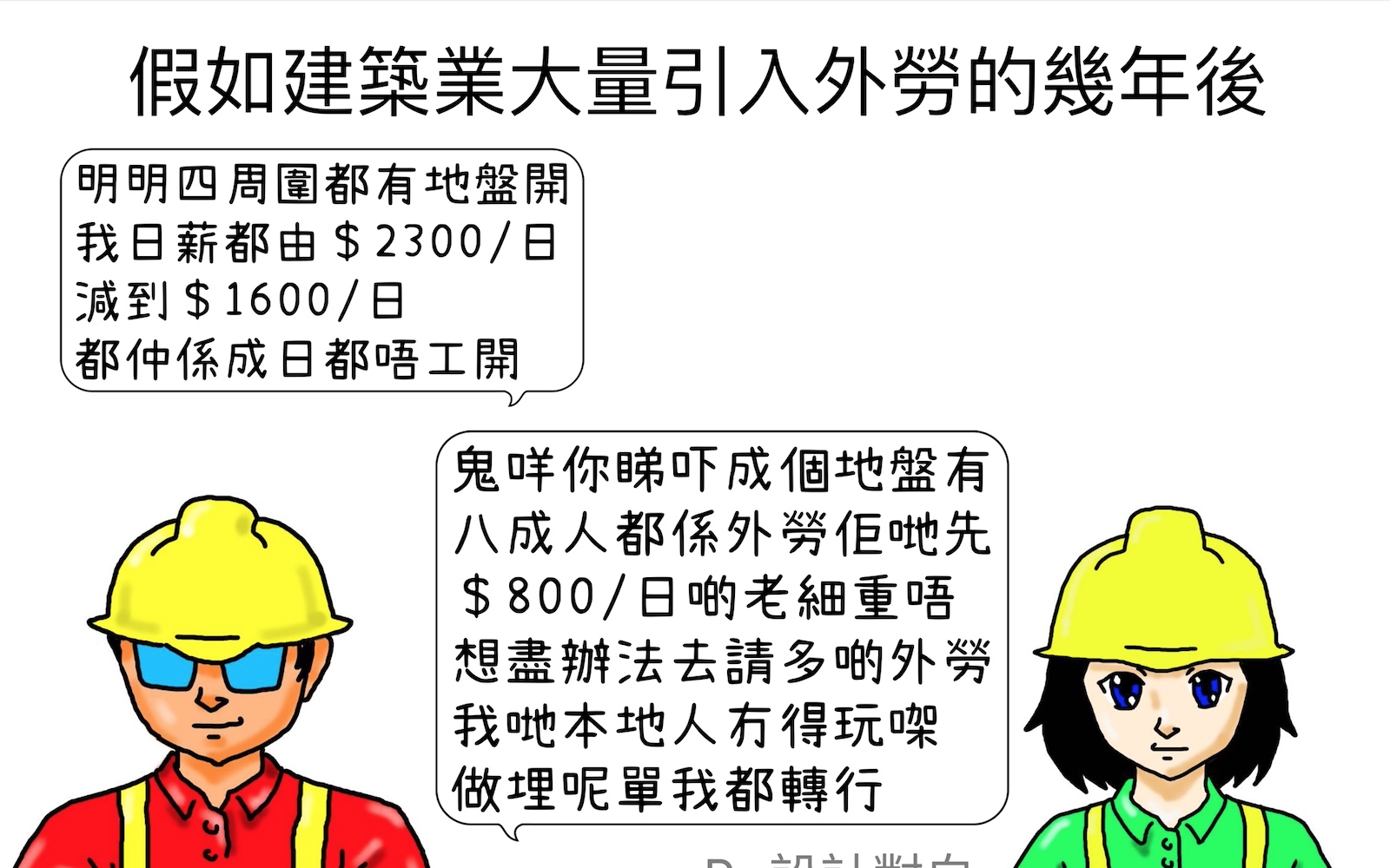 就業機會影響:外勞嘅加入可能會影響本地居民嘅就業機會,例如澳門近年建築業因為有大量外勞加入令到工人長期低落,例如紥鐵佬平均日薪都係得$793/日(2022年9月資料),好老實講呢個人工連外賣仔都打唔贏,入地盤咁辛苦嘅工作來講咁樣嘅人工邊度會有人入行,我喺澳門真係一個後生仔都未見過佢係喺地盤裏面落手落腳做嘅。香港而家號稱有六十萬嘅註冊建築工人,如果因為引入外勞令到有一半人失業另一半要減人工,呢度幾十萬人嘅生計究竟香港仲有冇其他行業可以吸納到呢?