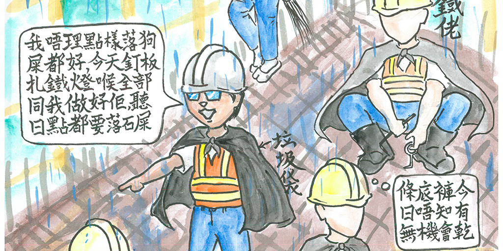 平時嘅地盤已經係地獄,落雨要上樓面做嘢係十級地獄。你以為喺戶外做嘢會有雨褸與雨傘嗎?你就想啦,其實得個垃圾膠袋嘅咋(我都知我係垃圾)。
