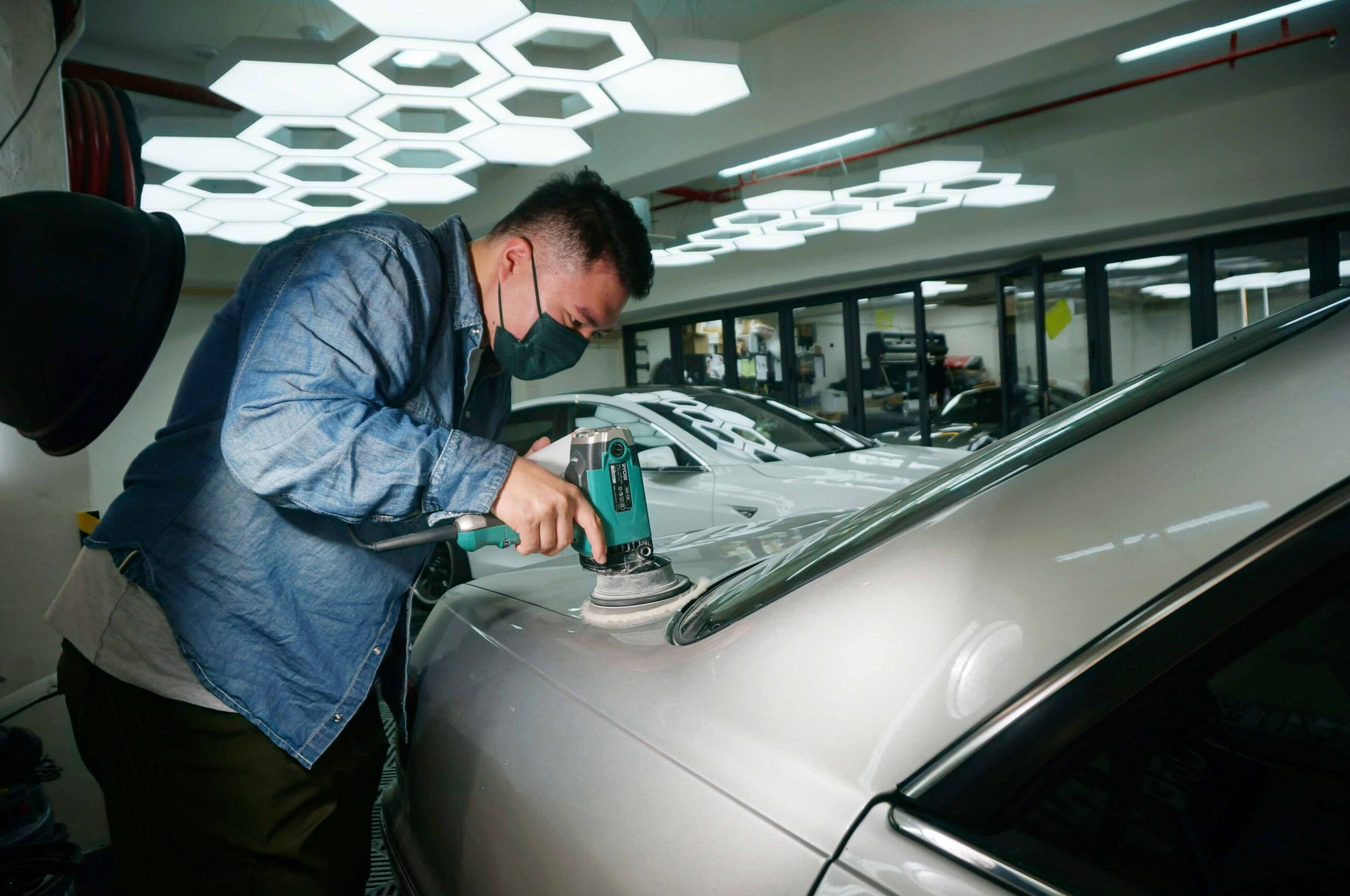 來到Marco工作的「車房」,牆身的燈管、頭頂的射燈讓這裏真的仿如舞台——維修車房和汽車美容車房原來不同,後者特別需要光,才能看清車的瑕疵。「汽車美容師傅就像皮膚科醫生,負責車輛外觀,即漆面問題。」而成為「醫生」之前,他只是個車迷,另有設計師的正職。