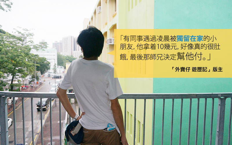 坐了幾天後,他聽同事建議「偷雞」走出球場,海闊天空。「終於有東西做!很開心,哪幢大廈都很記得。」外賣生涯就此展開。這些年來,遇過許多哭笑不得的事,例如有次客人叫了珍珠奶茶,地址不清,電話又打不通,幾經波折半個鐘後找到客人,對方說剛剛在舖裏收不到電話,發難要求重送:「啲熱飲變咗凍飲,凍飲變咗熱飲,你叫我點飲啊?」不過公司規矩不重送。也有同事遇過凌晨被獨留在家的小朋友,「他拿着10幾元,說哥哥我得這些,好像真的很肚餓,最後那師兄決定幫他付。」