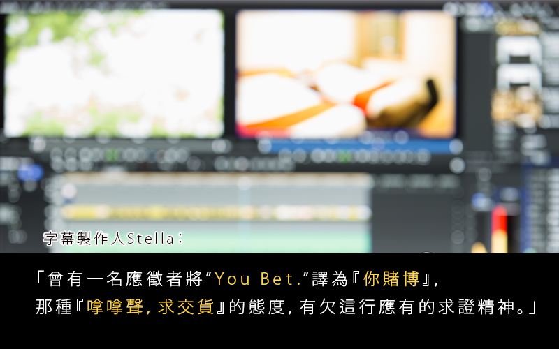 臨場測試既是一張那麼重要的「入場證」,想進場的人,其實要過怎麼樣的關?Stella透露,當然不是簡簡單單地在指定時間內,完成一篇翻譯。「我們公司以製作英譯中的字幕為主,當中的對白涉及很多Pun和Slang,如你不求甚解,敷衍去譯,日後將難以應付工作要求。」所以,這個Test,主要是去考一考應徵者的求證工夫,是否做足。