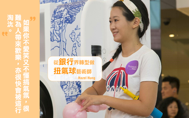 棄銀行而選氣球,是因為Hazel愈扭愈愛,她甚至遠赴美國參加世界氣球大賽(World Balloon Convention,WBC),和團隊憑6米高的虎王氣球雕塑而奪得世界冠軍。履歷亮麗,加上外向樂觀的性格,令她在這行極為搶手。「技術固然重要,但態度亦是關鍵。畢竟我們的對象以小朋友居多,如果你不愛笑又不懂搞氣氛,很難為人帶來歡樂,亦很快會被淘汰。」