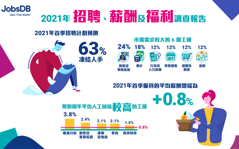 Jobsdb於2021年9 月委託獨立調查機構,訪問了本港438家商業機構,就2022年首季的招聘、薪酬及福利意向進行調查,結果顯示僱主預期來年打工仔平均薪金調整幅度為+1.7%,較2021年的+0.8%輕微回升近1%(+0.9%)。展望來年,普遍受訪者持審慎樂觀態度,招聘計劃方面亦預計逐步回復到疫情前的水平,超過三成(32%)僱主計劃於首季增聘全職人手以擴展業務,比去年同類型調查顯著回升18%。較多僱主認為除相關工作經驗外,求職者的工作方式和性格是否適合企業文化繼續成為重要的考慮因素。另外,今年亦有47%受訪企業於過去一年有聘請應屆畢業生。