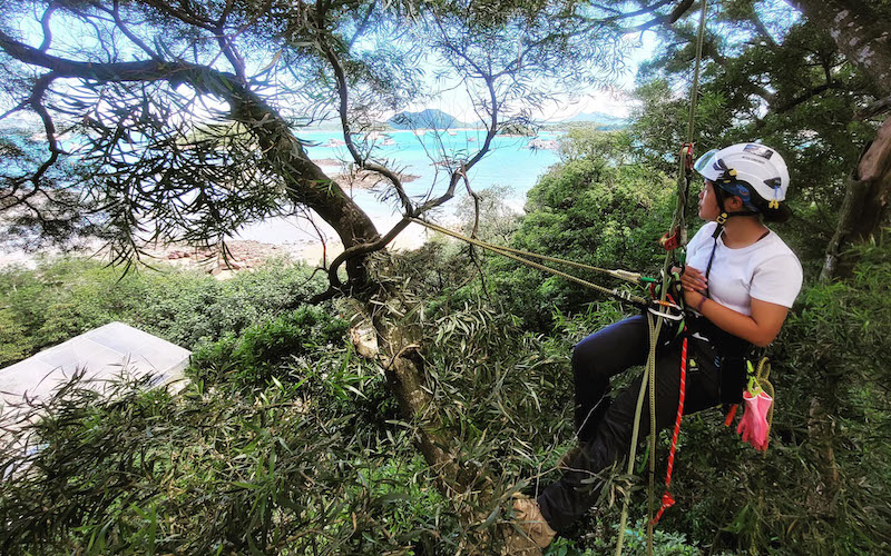 也因心態,她才沒錯過攀樹——攀樹其實涉及兩個前度,一個帶她攀樹,一個經她鼓勵入了行,卻在行內出軌。而她卻沒就此蒙上陰影,「你不放下就沒得向前行,行不行是看你決定而已。」她選擇將重點放回自身:「攀樹其實是我想做的。」第一次上樹時被樹包圍的感覺,她仍很記得。加上當時單車店工作也走到瓶頸,「要轉行都想過一輪,但人生要試新的事,而且就算要回頭都可以。」