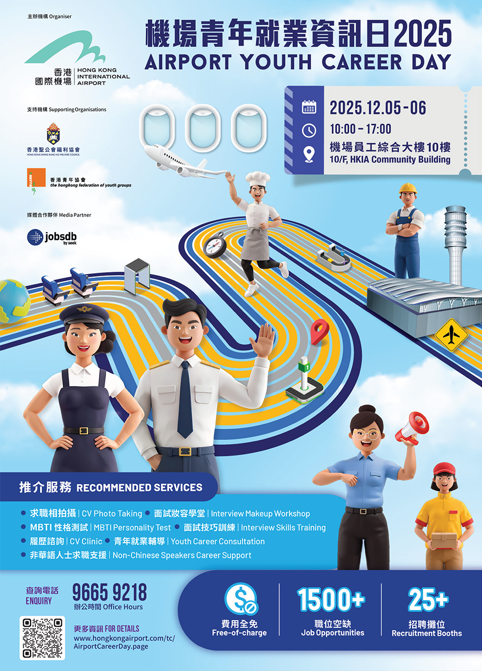 為協助本地青年掌握航空業增長機遇,香港機場管理局將於 2025 年 12 月 5 至 6 日舉辦「機場青年就業資訊日 2025」——提供超過 1,500 個職位空缺、逾25個招聘攤位,以及多項免費求職服務,助你以最佳狀態踏入前景亮麗的航空業。