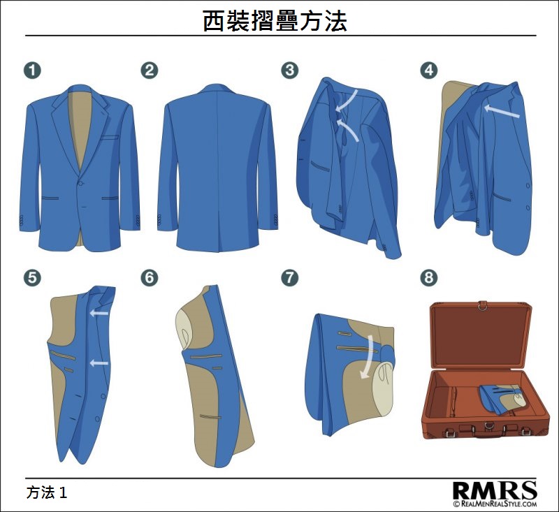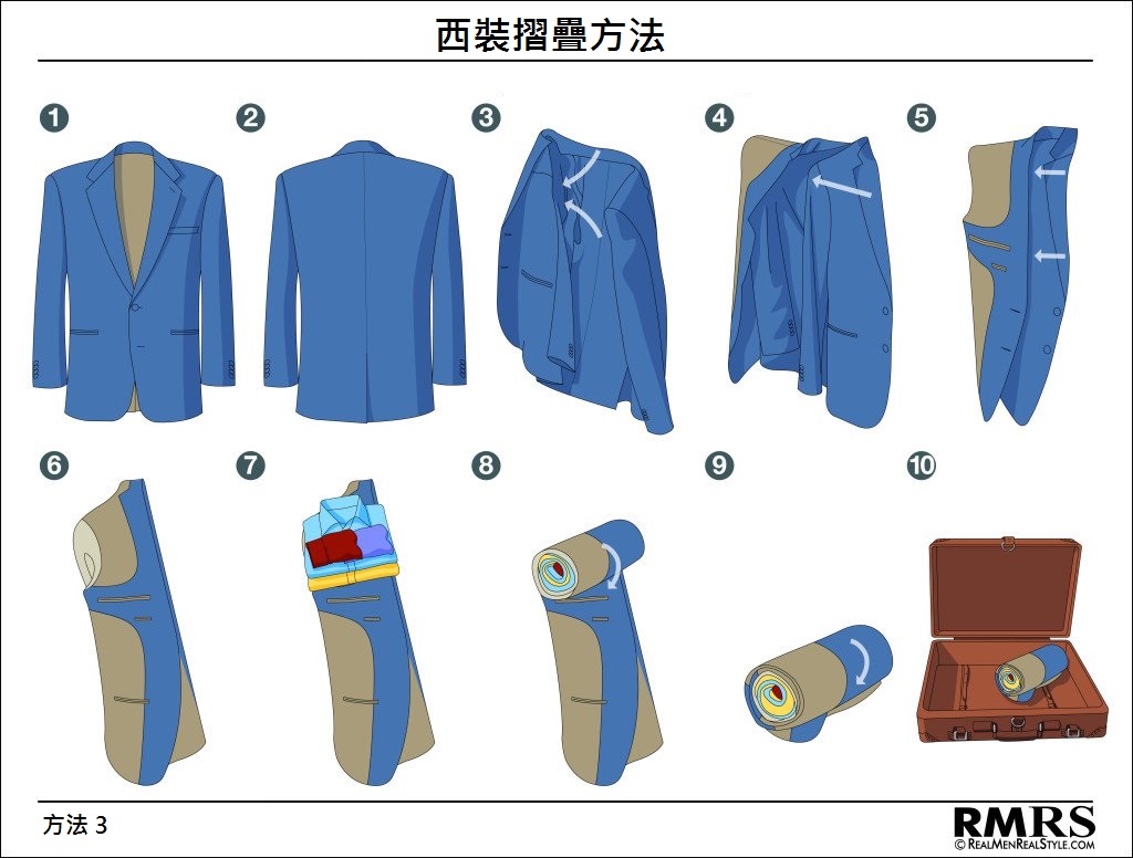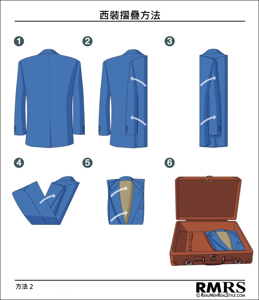 雖然不能完全避免出現摺痕,但當空間有限時,用這個方法能將西裝摺得非常薄,而且完成後裡布向外,能保護外套不會受損。