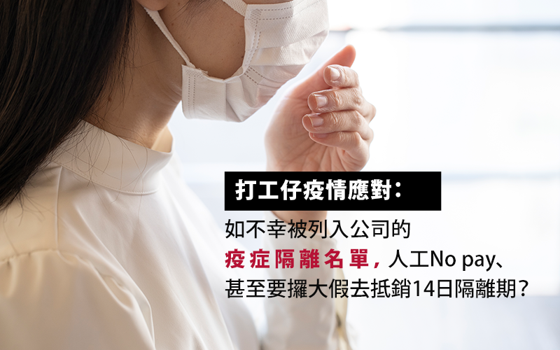 有些老闆讓隔離的同事安心隔離,不用工作,但就當放取有薪假期論,即隔離幾耐就扣同樣日數的年假。如遇上這個情況,要隔離的員工就要注意了。年假薪酬的每日款額相等於員工在年假當天或年假首天(如年假日數連續多於一天)前12個月內所賺取的每日平均工資。換句話說,你每一日有薪年假都是錢。如果多放了年假,分分鐘要在離職時要賠錢給公司。