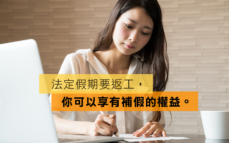 值得一提的還有,如法定假日適逢僱員的休息日,老闆應於休息日翌日補假。該補假日子須排除法定假日,另訂假日,代替假日或休息日的日子。放假要返工也有不同的條件及權益,打工仔如要在假期工作,必須小心分辨格假期種類,而爭取相關的權益。