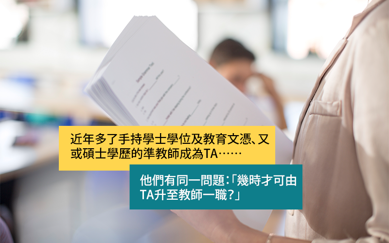 因此出現近年來手持學士學位及教育文憑、又或碩士學歷的準教師簽下合約制教師,甚至成為TA。TA與教學有關,但又是助理?簡單來說就是「雜工」,老師請病假便要代課,影印、過膠、記錄分數等是日常工作;校有活動而不夠帶隊老師,又是TA出動的時候,而每位老師也可都予他工作,在學生心中也許是教師,但在老師心目中也許是「助理」。幾時才可由TA升至教師一職?大多學校都會用拖字訣,「一年之後,又一年;三年之後又三年⋯⋯」。