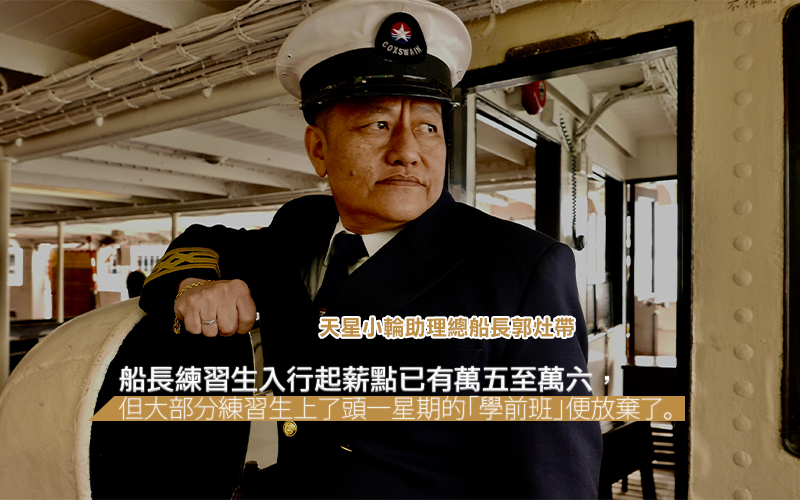 郭灶帶去考牌,考牌要筆試、電腦試、口試,考你所有海事處條例,熟讀了才有資格開船當船長。他那個年代用了5年時間,先考60噸船牌當上副船長,再考急救、救火、逃生牌,累積30小時駕駛經驗,再考300噸船牌,才算得上是船長。天星小輪的船期密,十分鐘一班船,所以船長行輪班制,分早午夜三更,夜更必須在船上過夜,留待開頭班船乘載第一班上班的客,才收工休息。如此連接五天夜更,便可連放五天假(有些情況可連放十天假)。