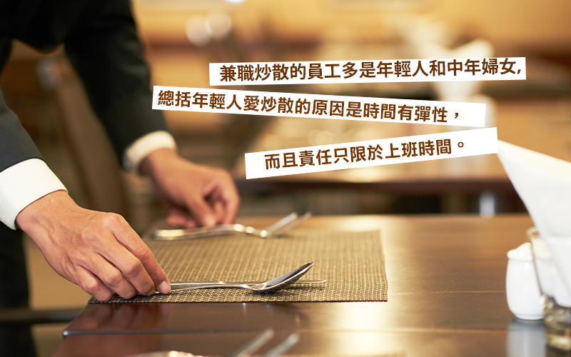 Brian指出在酒店兼職炒散的員工多是年輕人和中年婦女,總括年輕人愛炒散的原因是時間有彈性,而且責任只限於上班時間,不像經理級的員工般要常常OT。至於薪水和升遷,亦不是他們最看重的一點,他們只求有一定的收入之餘,還能有充裕的時間進修、旅行或做自己喜歡的事。