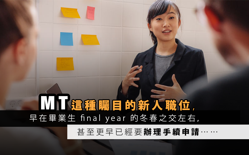其實一般而言, MT 這種矚目的職位,早在畢業生 final year 的冬春之交左右,甚至更早已經要辦理手續申請,皆因招聘過程繁複,由數百甚至數千名求職者當中,要篩選出 best of the best ,精英中的精英,當中可能經過網上的自我評估或性向測試 (aptitude test) ,將缺乏操守或常識之輩剔除 (其實要在這些評估中失手都有一定難度⋯⋯) ;也會歷經筆試,被要求闡述觀點或展示解答難題 (problem-solving) 的能力;更可能要面對現職中高層的職員,在他們的旁觀下進行分組討論,示範如何與人交涉、談判以至促進項目進程的技巧。