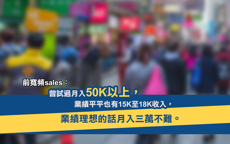 A: 曾試過月入$50,000以上,而行內的話,有聽過同行月入可以達近$100,000,但當然是極少數。現在就算是業績不理想的,一般也有$15000至$18,000,業績好的大概有$30,000以上。至於說要多少營業額,這很難回答,因為業績浮動,有時公司會減價促銷,營業額自然上升,但公司也會將目標提高,所以收入落差不會太大,畢竟羊毛出自羊身上。