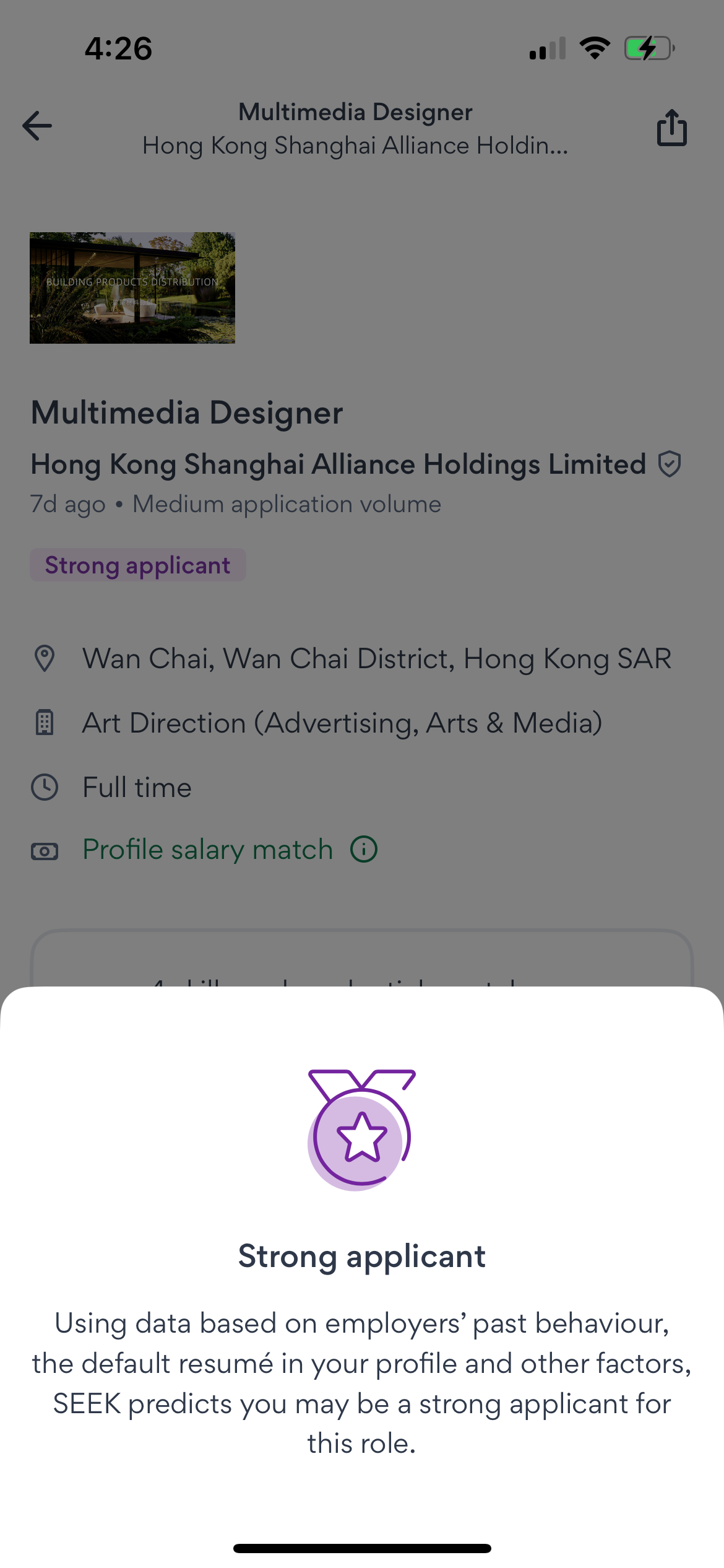如你的profile與職缺高度匹配,在招聘廣告上會展示一個圖形星形徽章,並列明”Strong applicant”。