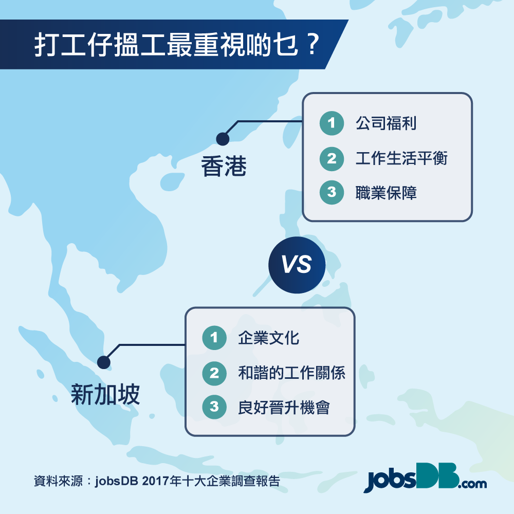 調查發現各地區的受訪者在選擇僱主時所優先考慮的因素大不相同。香港人最看重「公司福利」、「工作生活平衡」及「職業保障」,而新加坡人則把「專業的企業文化」、「和諧的工作關係」和「良好晉升機會」列為優先考慮的因素。