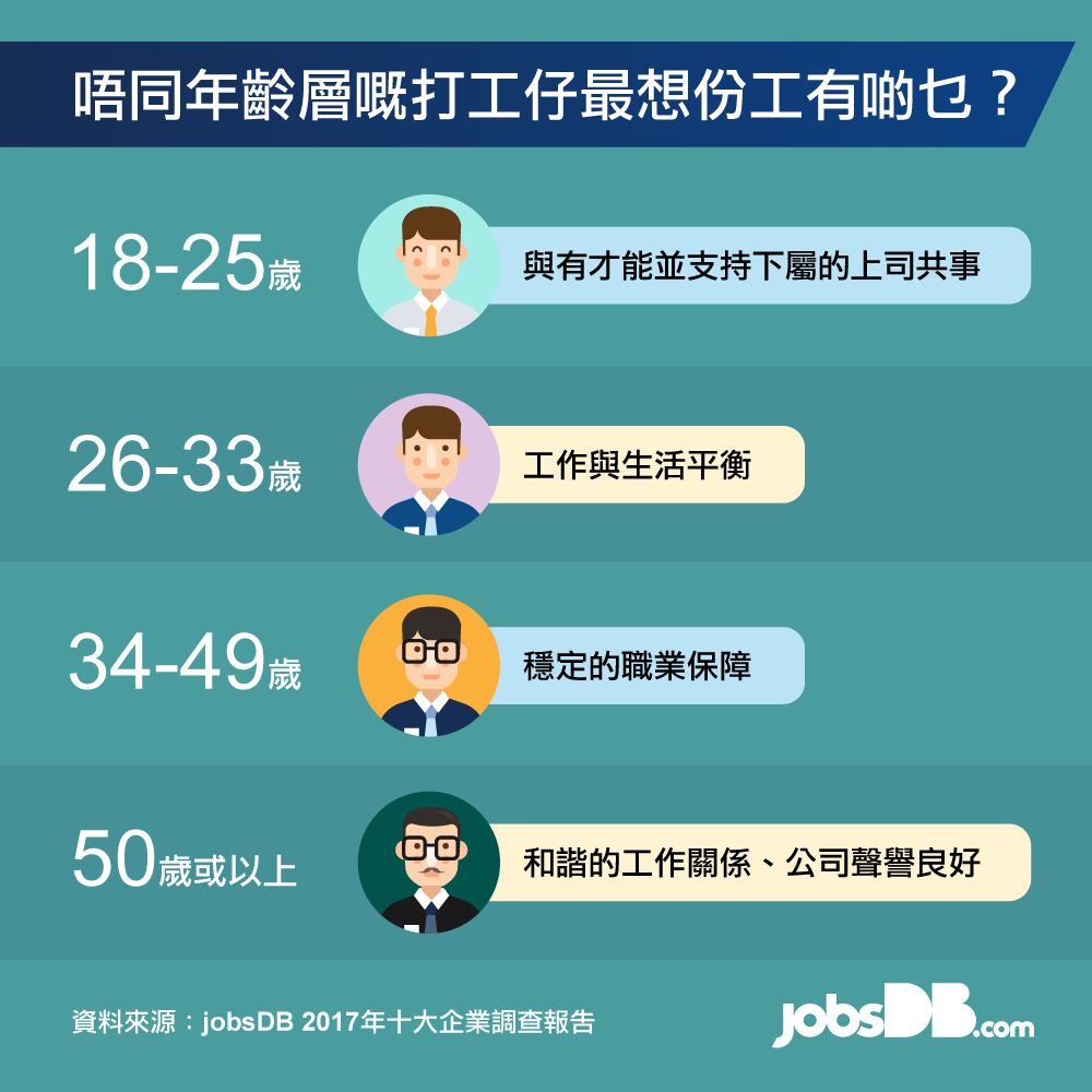 Jobsdb香港區總經理仇崑石表示:「隨著年齡和經驗增長,打工仔所重視的事情亦會隨之而變化。從我們這次的調查結果所見,本地僱主在招聘人才時應留意不同世代所重視的因素,並建立相應的人力資源和品牌策略來吸引不同年齡層的求職者。從招聘網站及社交媒體上的職位空缺廣告,到與求職者的電郵、電話和面試的溝通中,僱主都應傳遞出能迎合個別世代求職者所追求的機遇和價值觀。」