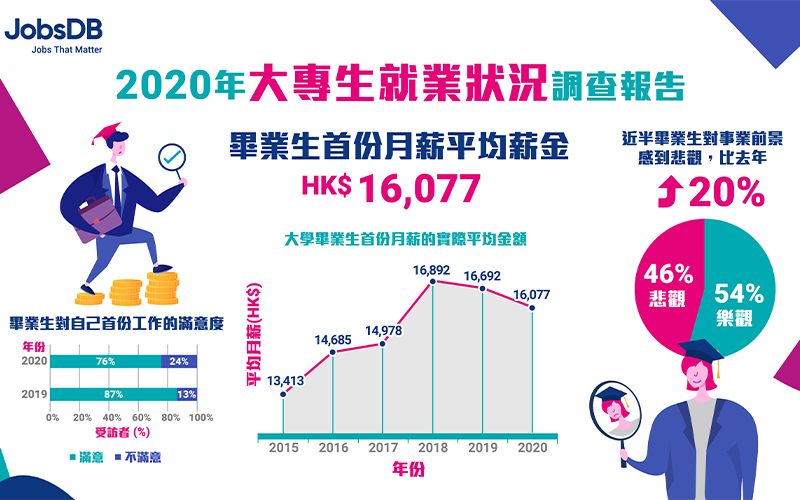 Jobsdb最新《2020年大專生就業狀況調查報告》於今年8至10月訪問了共1,197名本地大學生及畢業生,本年度大專畢業生首份工作的平均月薪為港幣16,077元,較去年調查的港幣16,692元稍降約3.7%,錄得連續兩年下跌。醫療及製藥(20,050元)為平均起薪點最高行業,其後分別為屋宇建築及建造(18,500元)及金融服務(18,321元)(見附件一)。報告同時指出,只有76% 畢業生滿意首份工作,比去年的調查下跌逾一成(11%)。對於事業發展前景,僅54%受訪者表示樂觀,比去年大幅下跌20%。