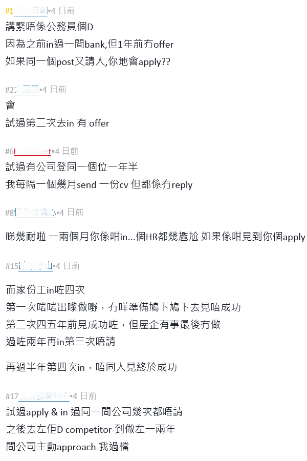 有網民在論壇開PO問:「你哋會唔會再in以前in過嘅工?」網民接着解釋:「講緊唔係公務員嗰啲,因為之前in過一間bank,但1年前冇offer,如果同一個post又請人,你哋會apply?」
