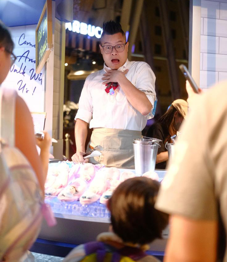 在另一次工作中他負責賣生蠔公仔,為它賦予生命,提客人要小心輕放,不要走太快,「不然牠會暈車浪。」童真的角度,令平日正經的大人世界都多了樂趣。