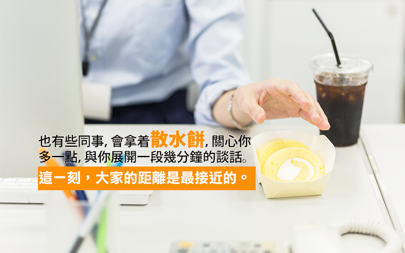 他對你說的也許都是一句簡單的「Good Luck」,但很奇怪,你就是分辨到他的感情,這兩個英文字就是有重量。頗窩心的。也有些同事,會拿著散水餅,關心你多一點,與你展開一段幾分鐘的談話。這一刻,大約彼此的距離是最接近的,因為大家少了利害關係,不需就住就住。