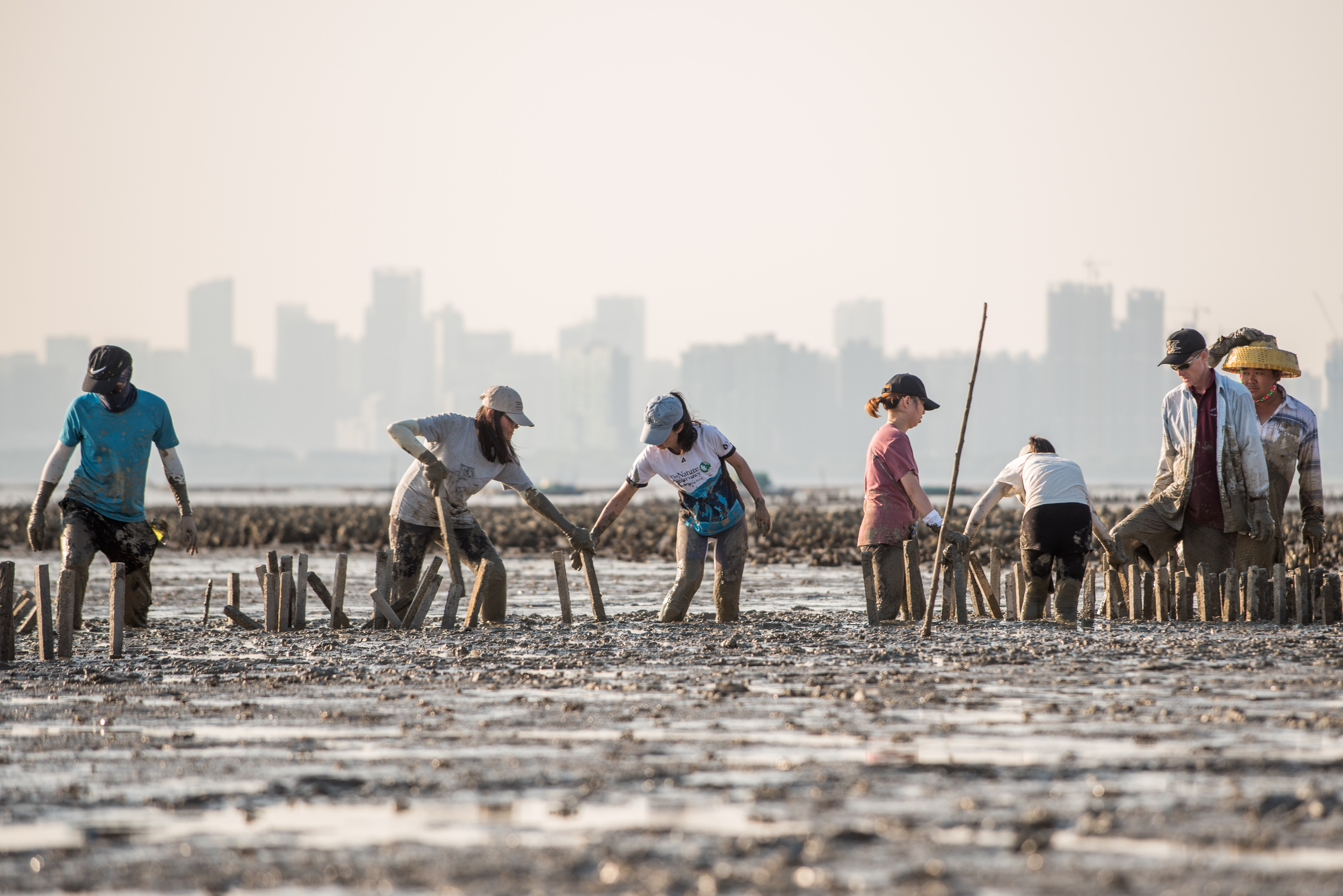 ▲Sharon(圖右)不時也身體力行,參與環境保育的工作,例如與同事於白泥廢棄的養蠔場,修復蠔礁,以助改善香港水質和穩定海岸線。